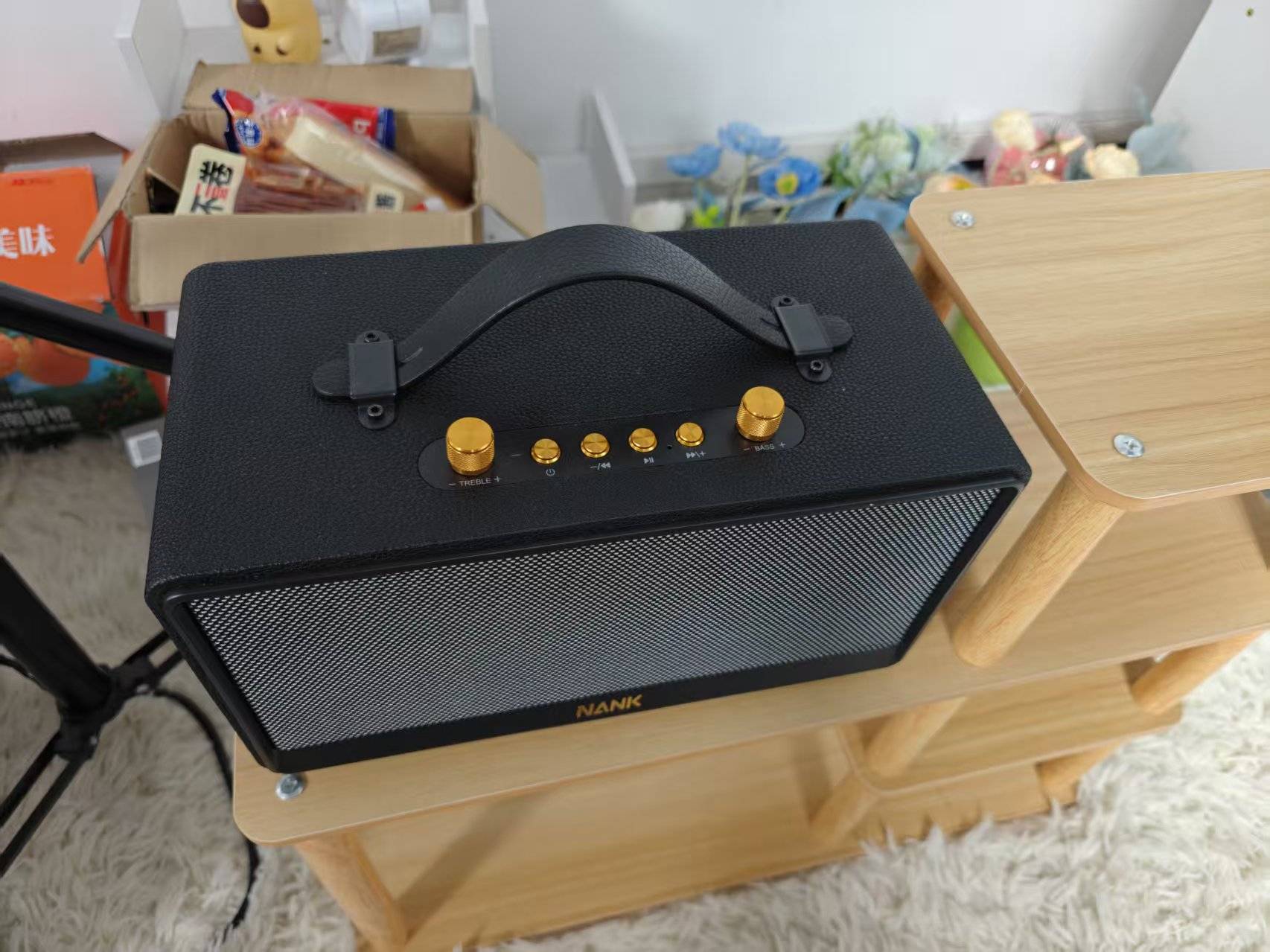 这款珠峰音响采用了复古监听风格,子夜黑与阳极金的配色既耐看又耐用,皮质包裹与油边工艺提升了整体质感。