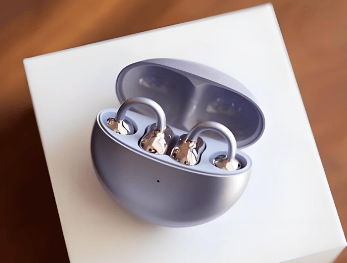 耳机金属耳挂与镜面腔体的组合,看起来就像是一件极具设计感的耳饰。整机线条流畅,细节打磨精致,无论是出街、通勤还是运动,都能和穿搭自然融合。它的小巧充电盒延续了简约风格,手感顺滑,拿在手里就是那种“贵但低调”的质感。