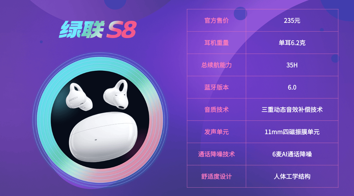 音质方面更是惊喜,搭载了11mm四磁振膜单元,还支持40kHz高频响应,有Hi-Res金标认证,连LDAC无损解码都能兼容,听着特别通透。尤其是中高频的细节,处理得特别到位,细微的音色变化都能捕捉到。加上空间音频算法,声场一下子变得立体又自然,仿佛身临其境。蓝牙6.0的芯片也很靠谱,连接稳得很,双设备切换毫不费劲,0.06s的低延迟闪连,不管听歌还是追剧都不脱节。续航也够用,单次能听8.5小时,总续航有35小时,平时不用老想着充电,日常用着特别省心。