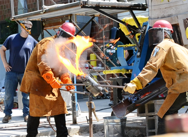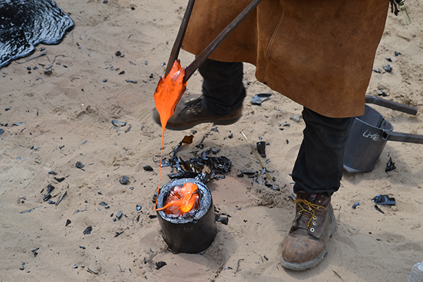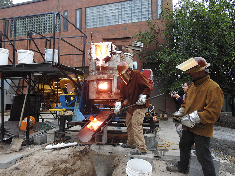 他们还希望以某种方式将熔岩推向空中,就像天然飞溅炸弹一样,所以他们从吹叶机开始。起初,团队成员蹲在熔岩喷出的熔炉槽的尽头,用空气喷射滴落的熔岩。