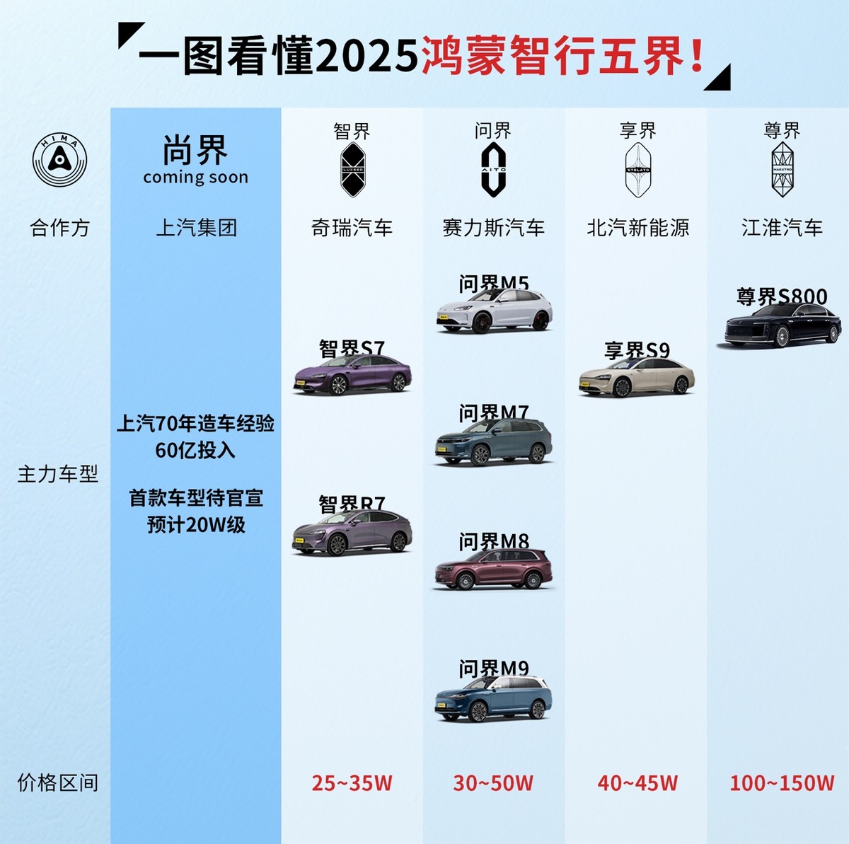 尚界的诞生备受关注。此前,华为已与赛力斯、奇瑞、北汽蓝谷、江淮汽车分别合作推出了问界、智界、享界、尊界品牌,均在市场上取得了不错的反响。而此次华为与上汽集团的合作,更是强强联合。上汽集团总裁贾健旭在发布会上表示,上汽集团将全力支持尚界,拿出最好的资源助力其成功。