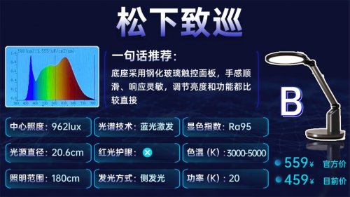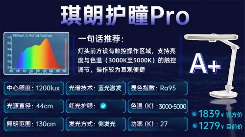 一句话推荐:拥有三分钟“红光”增益,为眼睛输送更多的“营养”;同时拥有OCLT光透镜技术,打造出99.6%还原太阳光的高品质光源,达到护眼更养眼的效果。