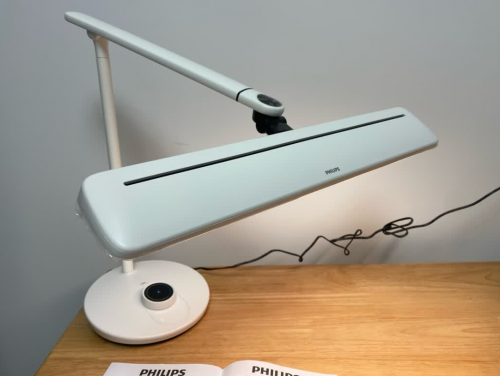 飞利浦轩泰这款台灯走简约实用路线,外观设计简洁,能融入多数家居风格,不突兀。操作方式采用整合式旋钮设计,将开关、亮度调节、模式切换功能整合一体,转动即可完成设置,相比触控面板不易误触,对孩子和老人更友好。灯臂采用双转轴设计,支持上下、前后角度调节,能适配日常读写的基础坐姿需求。灯头内部加入偏光透镜,光线分布相对集中,桌面中心区域亮度充足。但不足也很明显:采用直发光设计,近距离直视灯头会有刺眼感,使用时需调整角度避免正对光源;无自适应调光功能,环境光变化时需手动调整亮度,整体属于中规中矩的基础款。