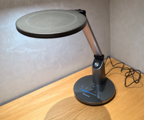 松下致巡的质感表现尚可,采用铝合金与ABS组合材质,上手有一定高级感,灯体结构稳固。搭载全光谱灯珠,配合圆盘形灯头,照明面积相对宽广;显色指数Ra95左右,能满足日常读写、办公的基础色彩还原需求。底座采用钢化玻璃触控面板,手感顺滑、响应灵敏,调节亮度和功能都比较直接。但短板突出:光谱中红光波段补足有限,蓝光成分相对偏高,眼睛敏感人群长时间使用易产生疲劳;灯头可调角度有限,场景适配灵活性稍弱,整体适合对护眼要求不高的基础使用场景。
