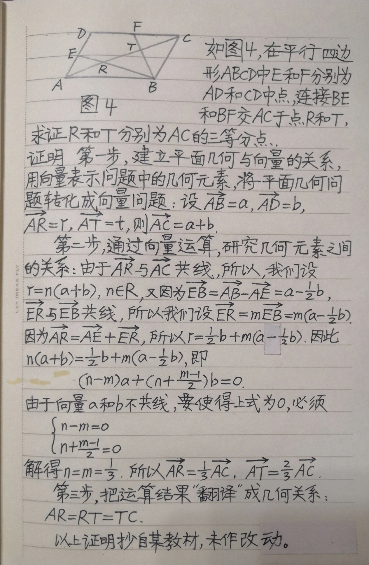 第一步,建立平面几何与向量的关系,用向量表示问题中的几何元素,将平面几何问题转化成向量问题:设 AB = a , AD = b , AR = r , AT = t ,则 AC = a + b .
