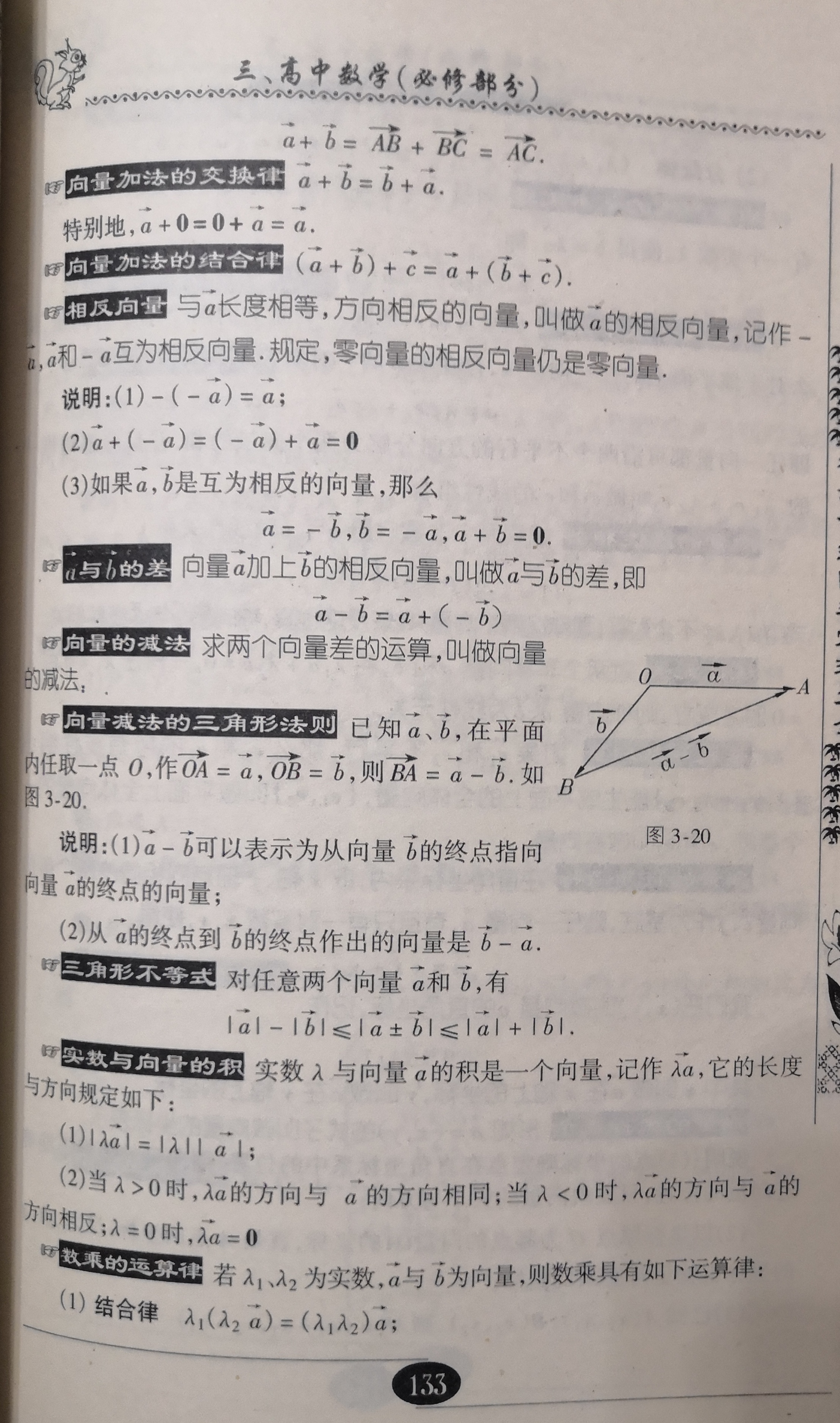 相反向量:与向量a长度相等,方向相反的向量,叫做a的相反向量,记作-a。
