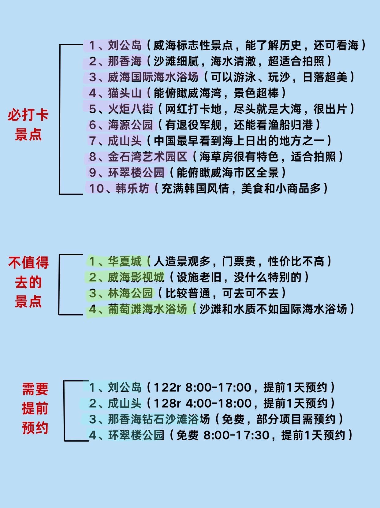 1. 刘公岛(威海标志性景点,能了解历史,还可看海)2. 那香海(沙滩细腻,海水清澈,超适合拍照)