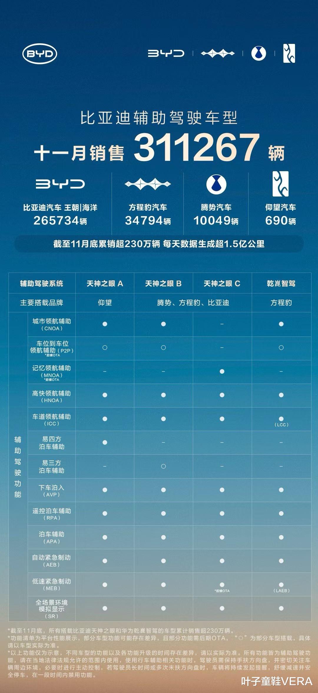 近日,汽车市场传来一则重磅消息:比亚迪公布了其搭载天神之眼辅助驾驶系统的车型在11月的销售佳绩。整个11月,该系列车型全月销量高达311267辆,这一傲人成绩不仅彰显了比亚迪强大的市场竞争力,更意味着它正以实际行动加速普及辅助驾驶,持续在汽车市场中引领潮流。