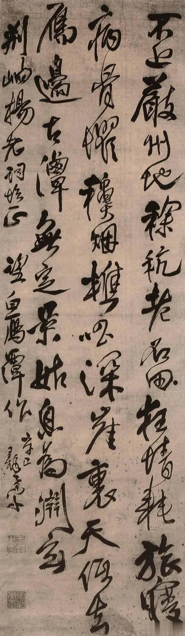 王铎《望白雁潭诗轴》,自署书于辛巳年(明崇祯十四年,1641年)51岁所作。行书,条幅,绫本。凡四行,共五十八字,纵155厘米,横45厘米,河南博物院藏。中锋尤多,笔势凝重,实属佳作。