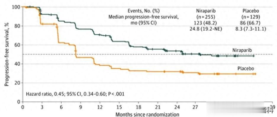 研究结果显示,与安慰剂相比,尼拉帕利可以显著延长患者的无进展生存期。在整体人群中,与安慰剂相比,尼拉帕利可以显著延长患者的无进展生存期:尼拉帕利组中位无进展生存期为13.8个月,而对照组为8.2个月,疾病进展或死亡风险降低约34%。