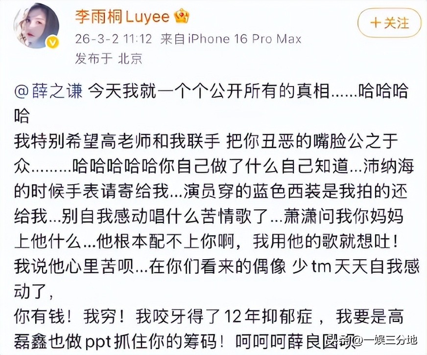 先是薛之谦被前任李雨桐发长文爆料婚内出轨,还索要天价离婚费。