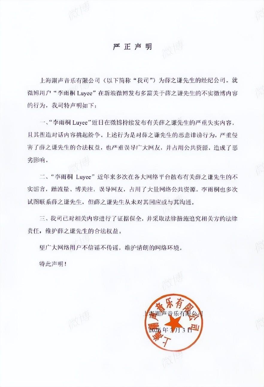 不过这件事薛之谦并没有回应,而是甩出了一张要采取法律措施追究的声明。