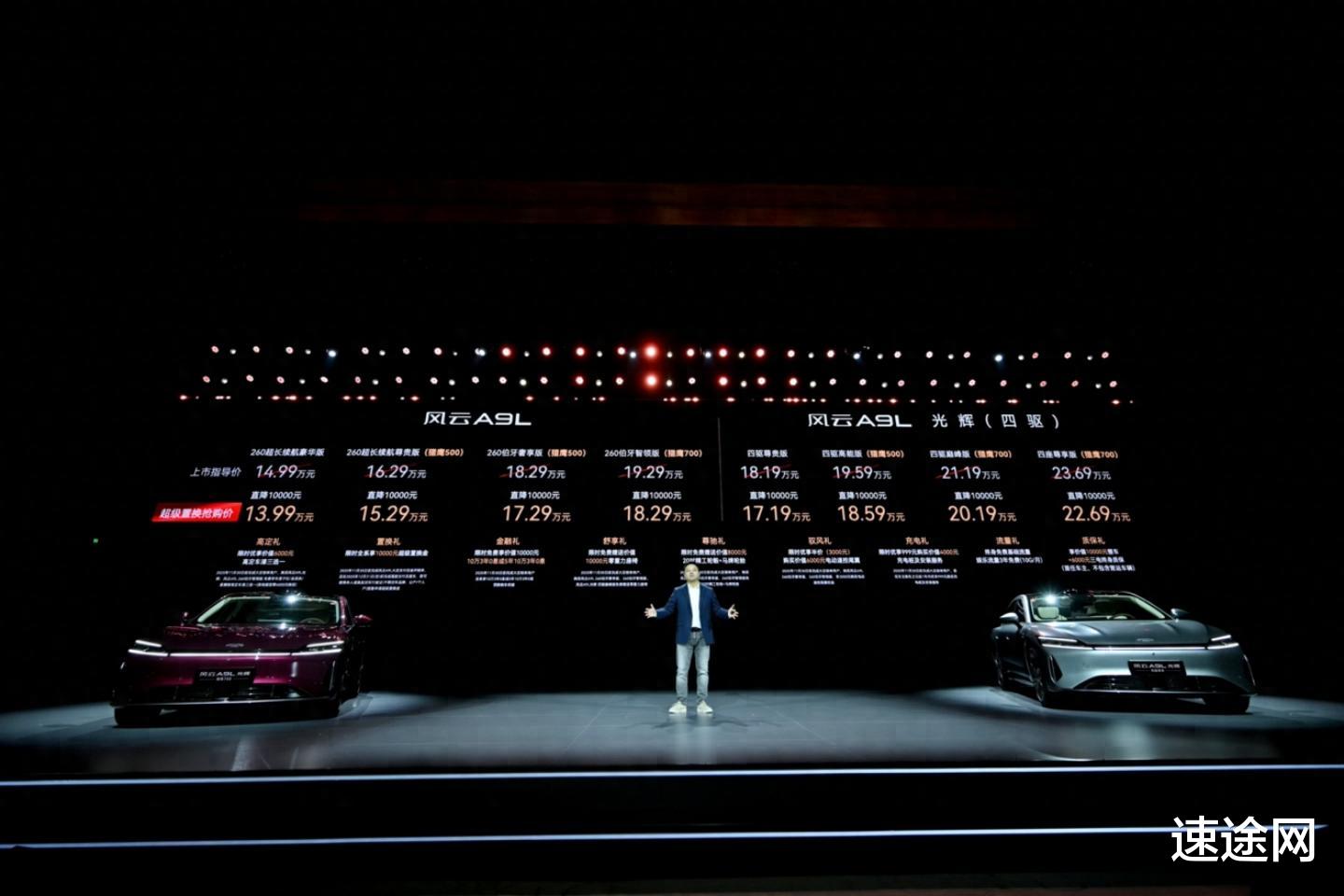 速途网11月15日消息(报道:李楠)今日,”进化”风云A9L光辉(四驱)全球上市发布会在重庆广阳岛国际会议中心隆重举行,本次上市共推出四款版型,正式售价为17.19万元起,共推出四个版本车型,其中四驱尊贵版售价17.19万、四驱高能版(猎鹰500)售价18.59万、四驱巅峰版(猎鹰700)售价20.19万、 四驱尊享版(猎鹰700)售价22.69万。并同步推出”九大购车权益”,涵盖高定、置换、金融、舒享、尊驰、驭风、充电、流量、质保多重礼遇,为中国豪华汽车市场再次立下全新标杆。