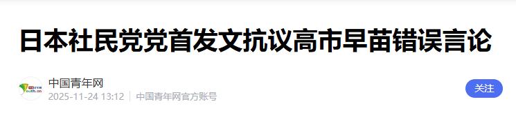 3.《日本社民党党首发文抗议高市早苗错误言论》2025-11-24 13:12 | 来源:中国青年网