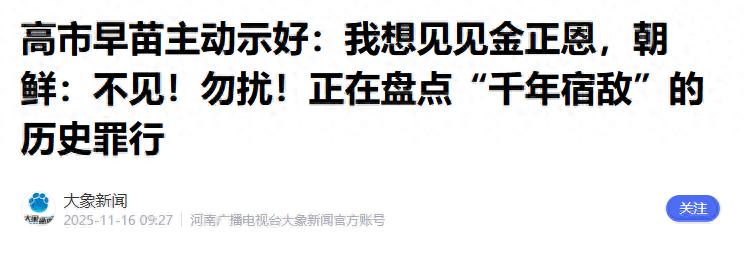 1.《高市早苗主动示好:我想见见金正恩,朝鲜:不见!勿扰!正在盘点“千年宿敌”的历史罪行》2025-11-16 09:27 | 来源:大象新闻