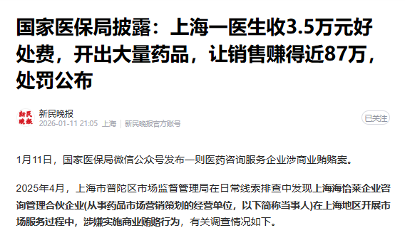 原文标题:国家医保局披露:上海一医生收3.5万元好处费,开出大量药品,让销售赚得近87万,处罚公布