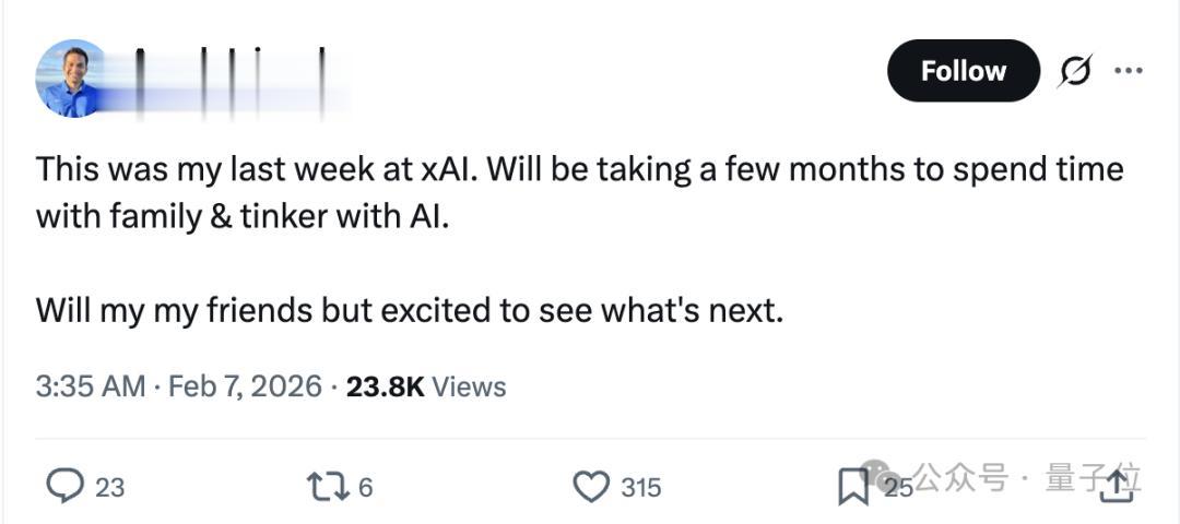 2月7号:xAI工程师Ayush Jaiswal宣布离职,表示准备暂时回归家庭。
