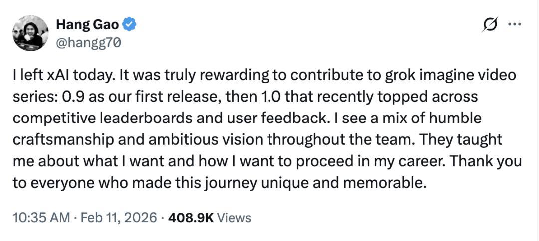同一天,参与Grok图像功能开发的高杭(Hang Gao)也宣布离开。