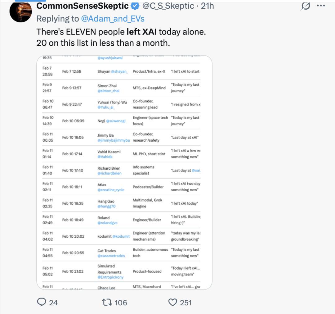 一天之内,两位联合创始人离开,一线员工集体在X上发“我从xAI离职了”,时间线密集到像下饺子。