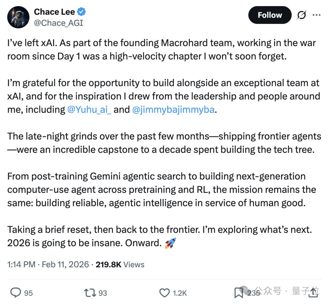 几个小时后,xAI旗下AI软件项目Macrohard创始团队成员Chace Lee也对外宣布离职。
