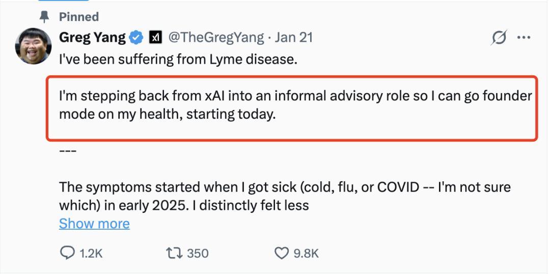 他在声明中表示,自己可能早已感染莱姆病,但在xAI创立初期长期高强度工作、过度透支身体,导致免疫系统受损,最终让病情显现并加重。