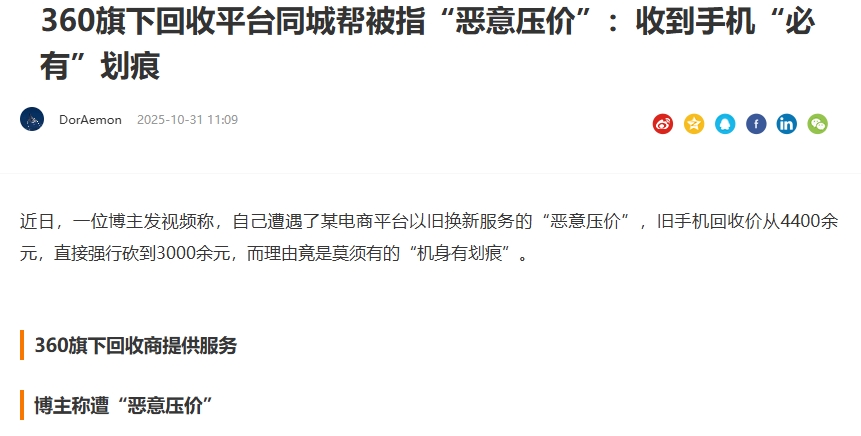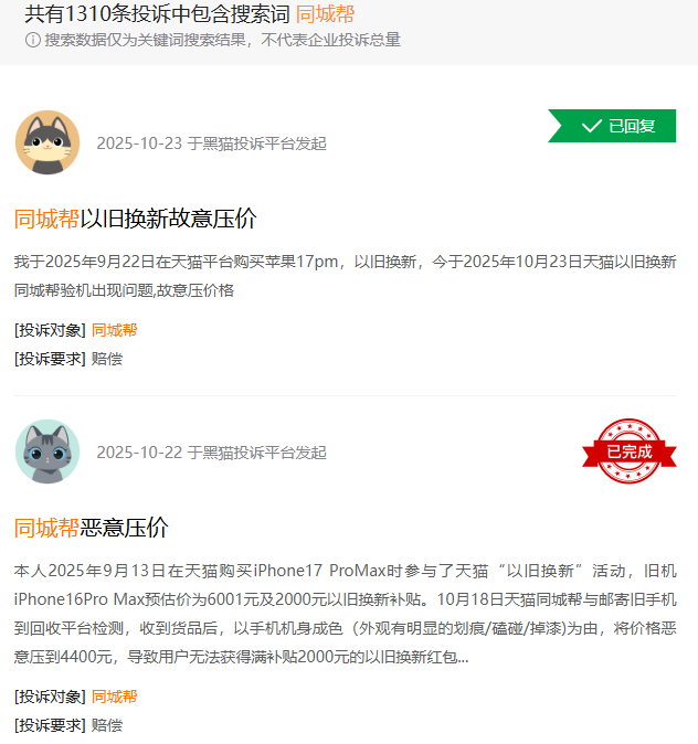 据该博主称,淘宝“以旧换新”是由一家名为“同城帮”的回收商提供服务,经查证,“同城帮”是360旗下提供手机、数码产品回收、以旧换新服务的平台,主要与天猫、苏宁等电商平台合作。然而,据黑猫投诉平台,对同城帮的投诉达1310条,投诉内容多为恶意压价。