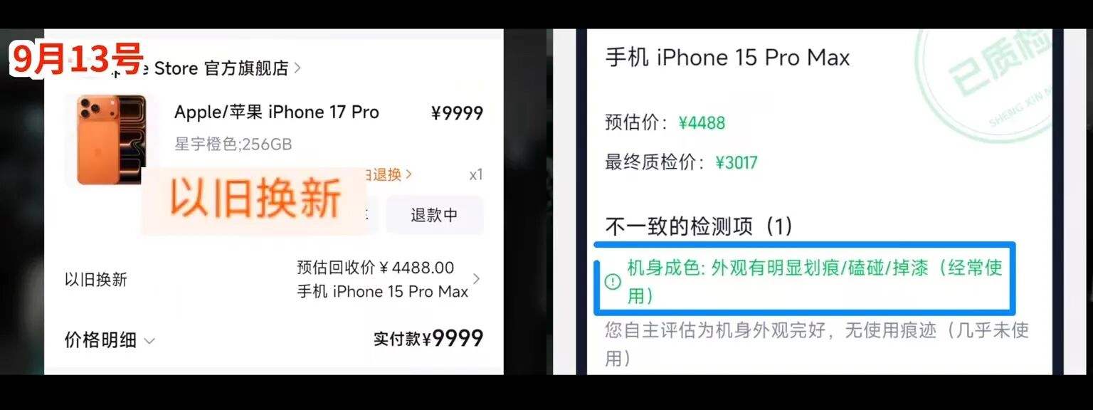 据该博主介绍,今年9月13日,自己在淘宝的苹果旗舰店以“以旧换新”购买iPhone 17 Pro Max,当时回收旧手机(iPhone 15 Pro Max)评估价格为4488元。然而当平台收到旧手机后,回收价格变更为3017元,系统增加了一个不一致的检测项,“机身成色:外观有明显划痕/磕碰/掉漆(经常使用)”。