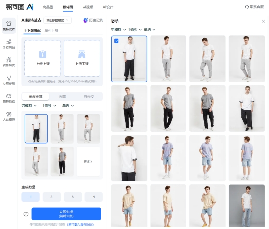 上传好服装之后接下来就是挑选模特了,你可以直接用系统里的预设模特,里面有不同年龄、不同身材还有不同风格的模特,你可以根据自己的服装风格来选,还能同时选多个不同的姿势,一次性生成多张不同角度的图片,要是系统里的模特不符合你的需求,你也可以上传自己的模特图,不过要注意模特得面向镜头,而且只能是单人模特,背身或者多人的话,生成的效果会不太好,没办法精准的把衣服贴合上去。