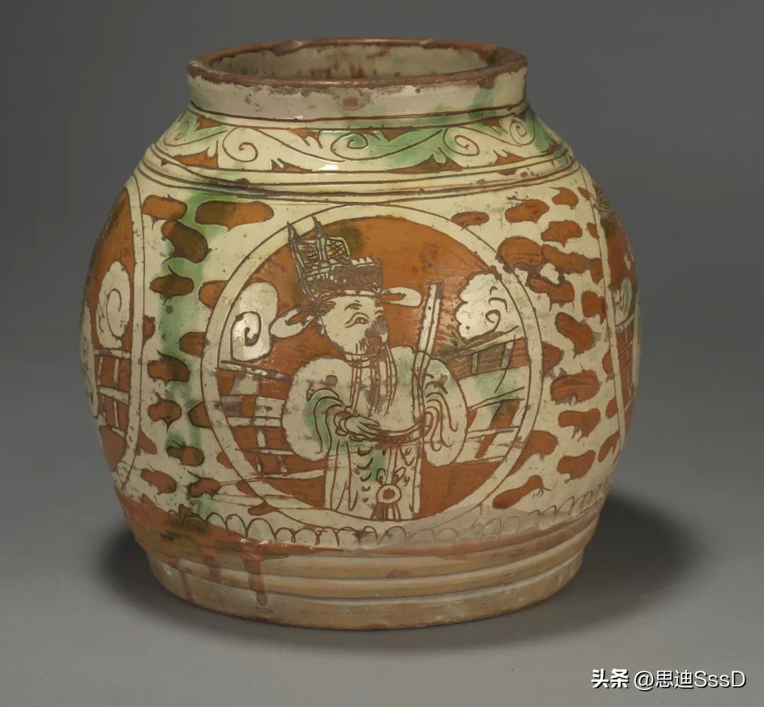 清界首窑福禄寿喜人物纹罐,此件清界首窑福禄寿喜人物纹罐是界首彩陶中的一件精品,剔花工艺,罐体唇口直颈,溜肩鼓腹,其上分别刻画卷草纹和开光人物纹。主体纹饰由一朵朵如意云纹组成四个圆形开光,开光内各刻画一个人物,分别为福禄寿喜四星,表面施以绿釉装饰,人物刻画生气十足,让人爱不释手。