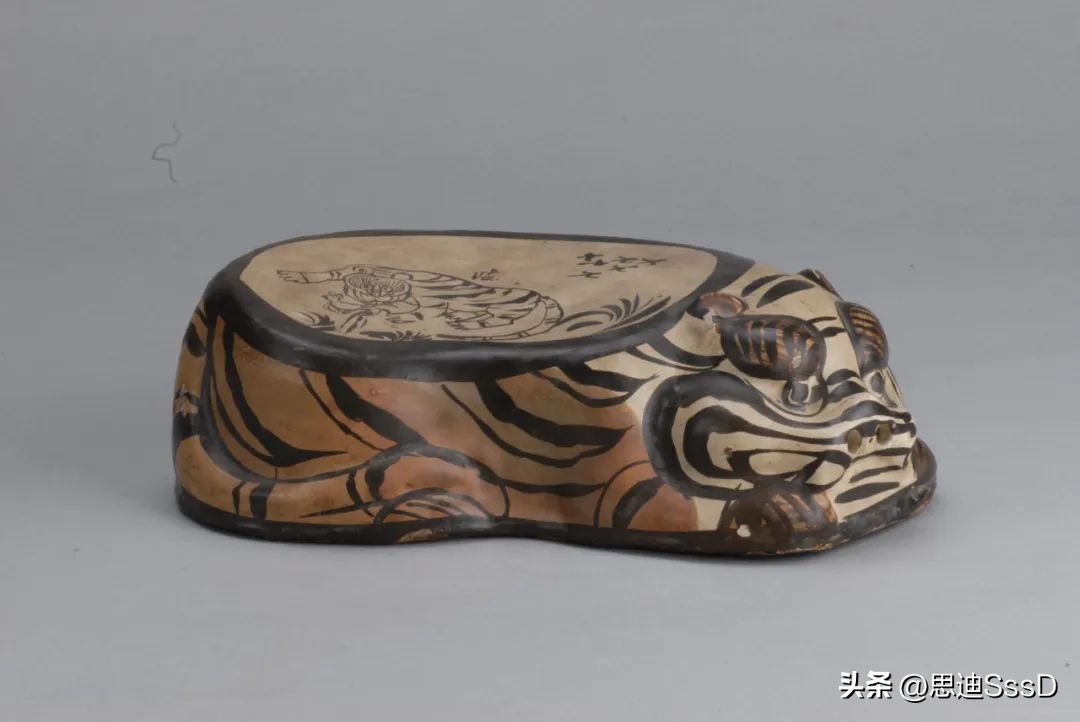 金白釉褐彩虎形瓷枕,瓷枕作卧虎造型,白釉胎上以褐彩和黑彩绘出虎纹、草丛、飞鸟等图案,表现力生动。作为辟邪象征,虎形枕寓意镇邪安神,也折射出金代北方民族与中原文化融合下的民间审美。枕上书“虎”字,寓意直接而有力。