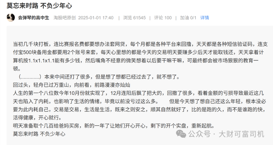 2023年,一位名叫“会弹琴的高中生”的湖南用户开始在淘股吧活跃,起初没人在意这个新手。他发帖自曝15岁就揣着5000元入市,上课间隙偷偷用手机看盘,最惨时“连炒股比赛报名费都要想办法套网贷,每个月都是各种平台来回撸,天天收各种短信验证码,连支付宝500块备用金都要用2个账号套取”,还调侃自己“天天拿着计算器按1.1×1.1×1.1,幻想复利后的财富,嘴角刚扬起微笑就被市场狠狠教育”。