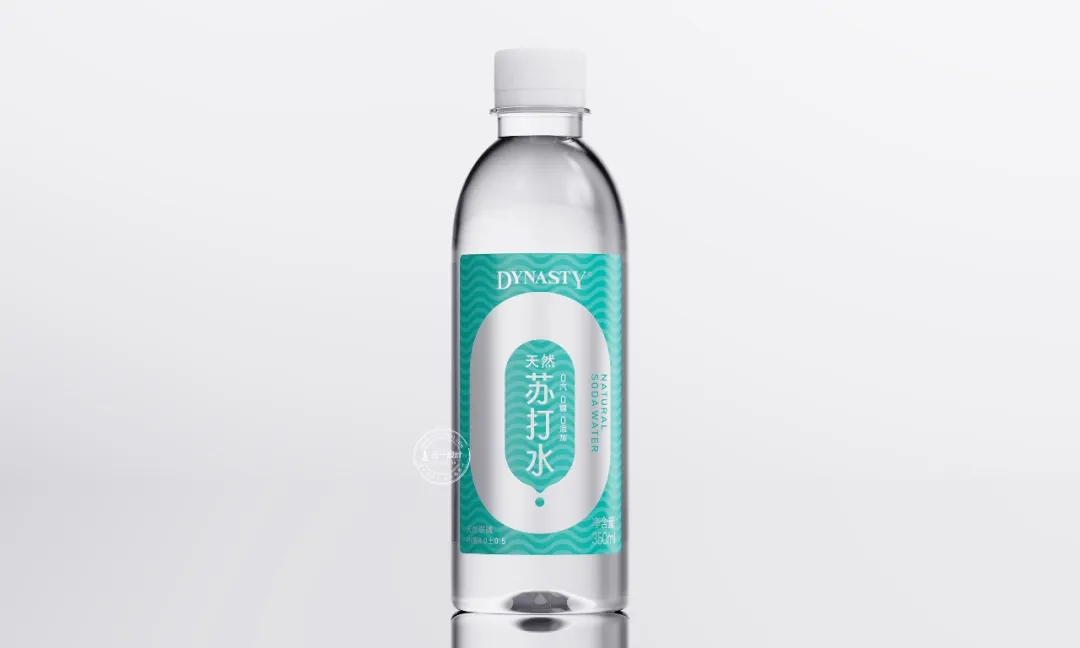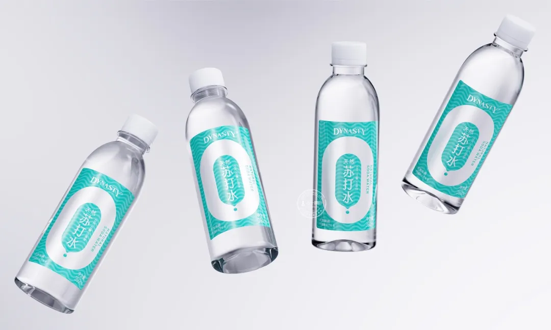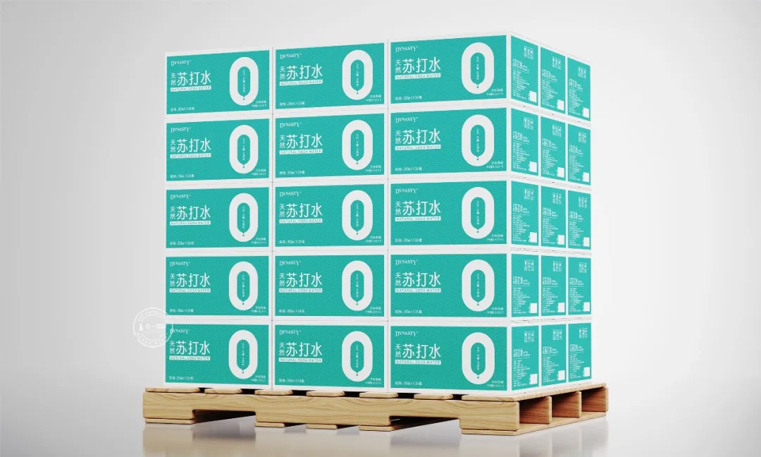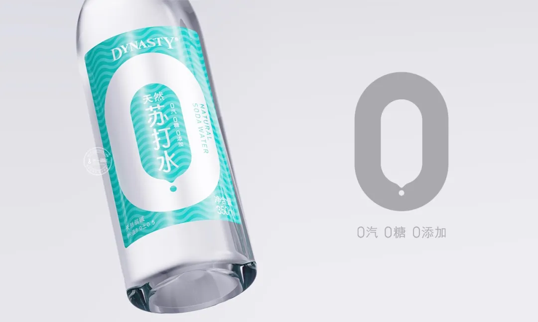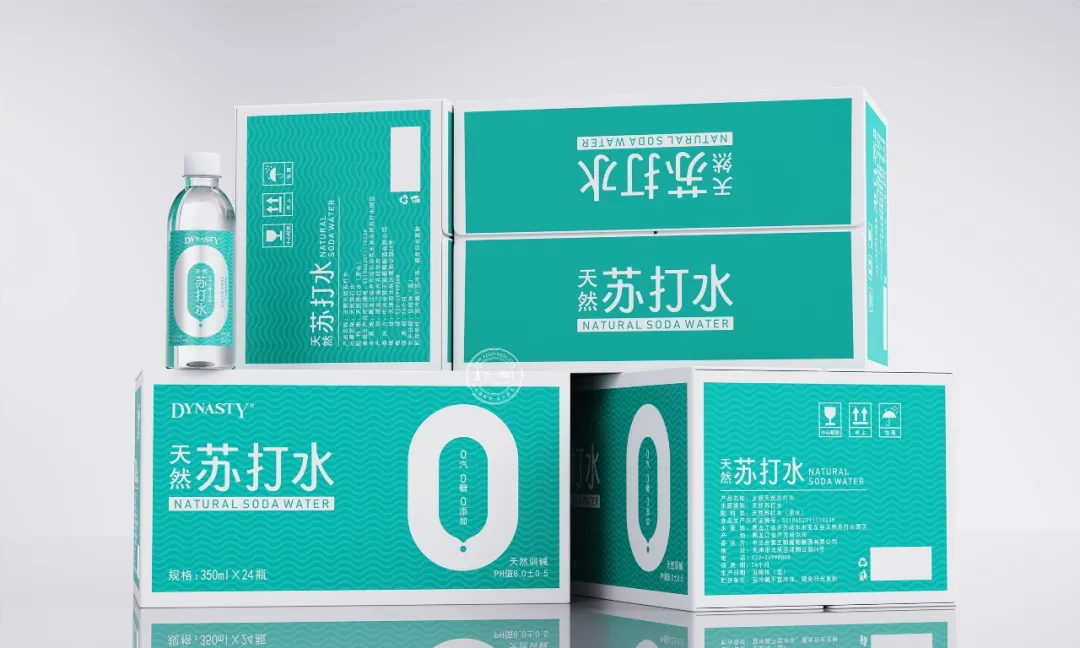:正面以 “0” 符号为视觉核心,嵌套 “天然苏打水” 品名与 “0 汽 0 糖 0 添加” 卖点,顶部标注品牌名 “DYNASTY”,底部补充 “天然弱碱” 与规格信息,兼顾美观与信息传递效率;礼盒延续瓶身视觉语言,强化系列化识别。