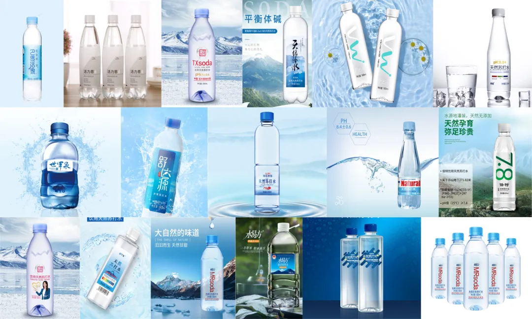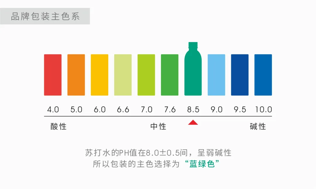 :结合苏打水弱碱性(pH 值 8.0±0.5)的属性,选用蓝绿色为主色调,既契合天然弱碱的健康感知,又区别于市场常见的蓝色系包装,形成清新通透的视觉记忆;搭配水波纹底纹,传递水源纯净、自然鲜活的产品气质。