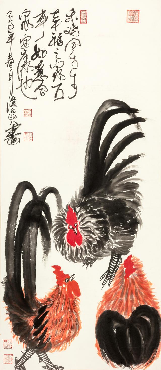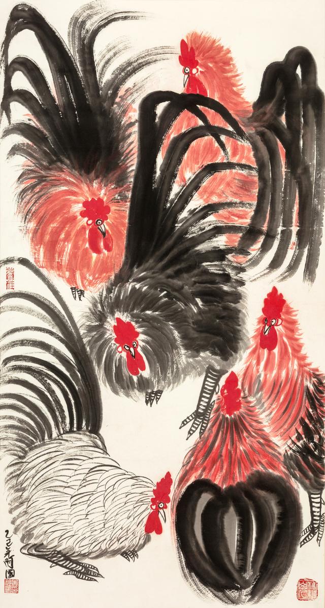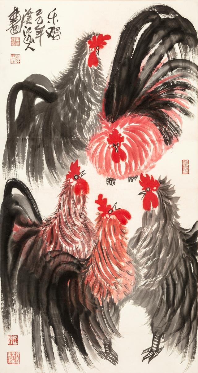 在中国写意花鸟画的历史长卷中,鸡的形象承载着丰富的文化内涵。从宋徽宗《芙蓉锦鸡图》的宫廷雅致,到齐白石笔下农家院落的勃勃生机,鸡这一寻常家禽在丹青世界里获得了不寻常的艺术生命。当代画家朱祖国先生以独特的指墨技法演绎雄鸡形象,既延续了传统文脉,又开创了个人风格,在当代语境中重新诠释了这一经典题材。