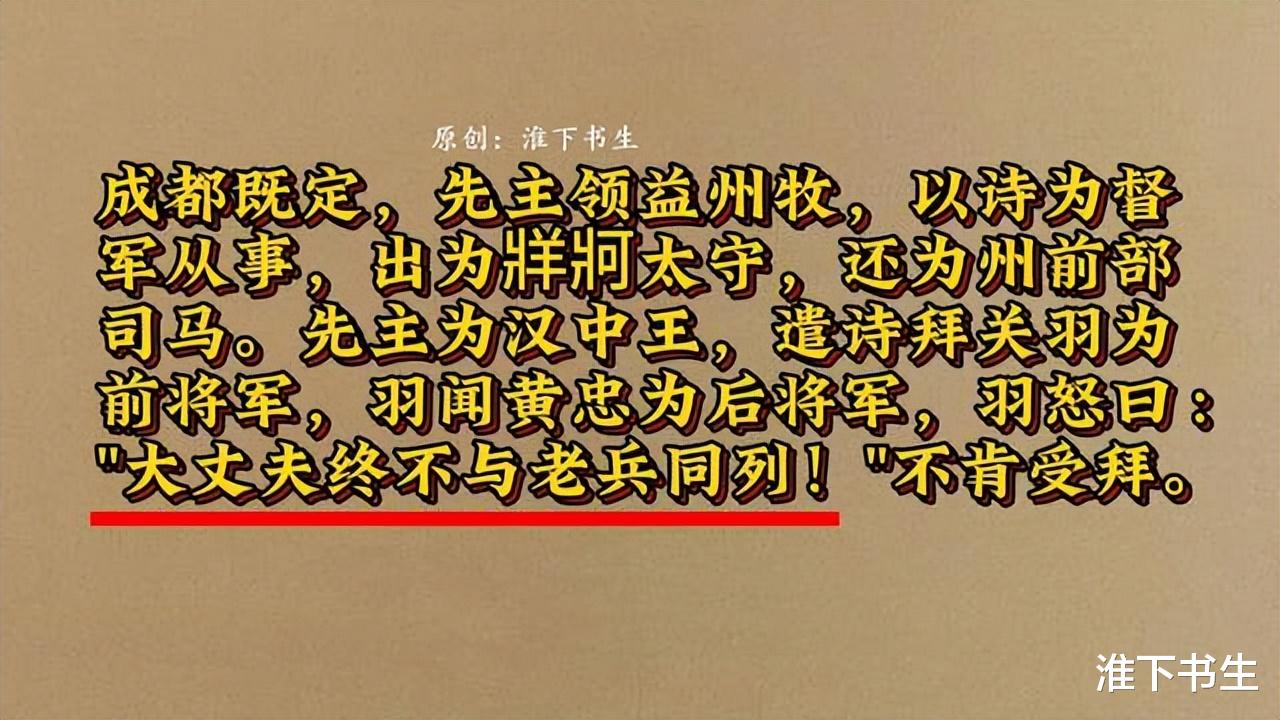 不过,《三国志·霍王向张杨费传》里,还是有一些蛛丝马迹的。比如刘备称汉中王时,任命关羽为前将军,张飞为右将军,马超为左将军,黄忠为后将军。当镇守荆州的关羽得知黄忠被拜为后将军时,愤怒地骂道:“大丈夫终不与老兵同列!”