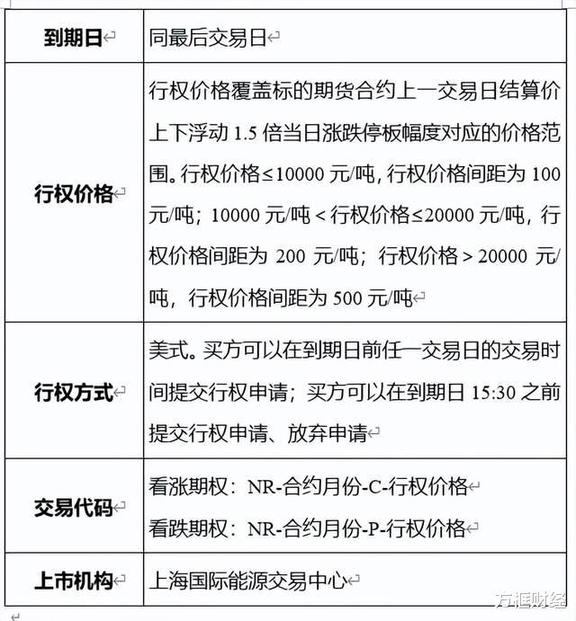 20号胶期货期权合约以20号胶期货合约为基础,标的物为20号胶期货合约,交易单位为1手20号胶期货合约,报价单位和涨跌停板幅度与标的20号胶期货合约相同,最小变动价位为1元/吨。行权价格覆盖标的期货合约上一交易日结算价上下浮动1.5倍当日涨跌停板幅度对应的价格范围;行权价格≤10000元/吨,行权价格间距为100元/吨;10000元/吨<行权价格≤20000元/吨,行权价格间距为200元/吨;行权价格>20000元/吨,行权价格间距为500元/吨。行权方式为美式,买方可以在到期日前任一交易日的交易时间提交行权申请。