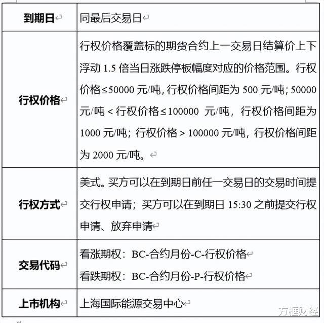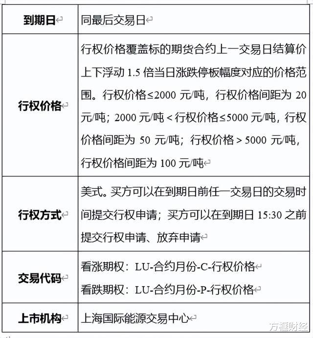 低硫燃料油期货期权合约以标的低硫燃料油期货合约为基础,标的物为低硫燃料油期货合约,交易单位为1手低硫燃料油期货合约,报价单位和涨跌停板幅度与标的低硫燃料油期货合约相同,最小变动价位为0.5元/吨。行权价格覆盖标的期货合约上一交易日结算价上下浮动1.5倍当日涨跌停板幅度对应的价格范围;行权价格≤2000元/吨,行权价格间距为20元/吨;2000元/吨<行权价格≤5000元/吨,行权价格间距为50元/吨;行权价格>5000元/吨,行权价格间距为100元/吨。行权方式为美式,买方可以在到期日前任一交易日的交易时间提交行权申请。
