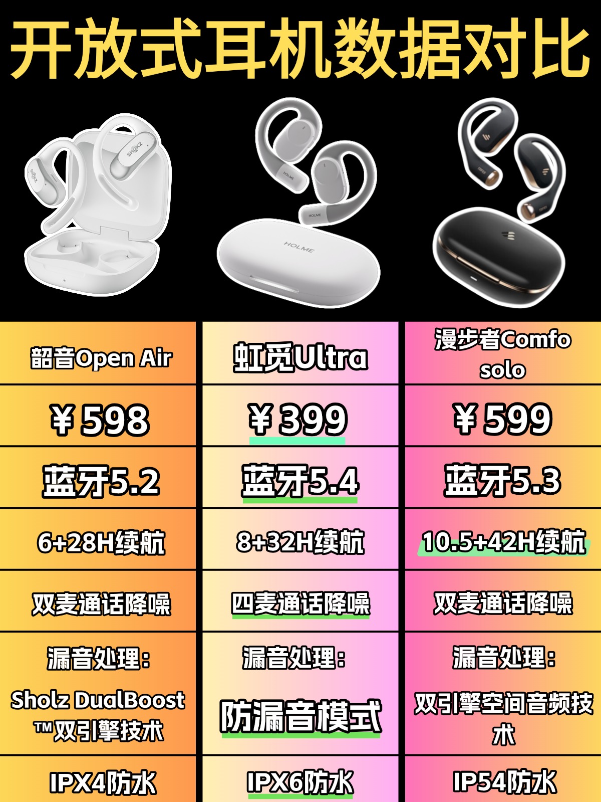 - 韶音Open Air售价628元,依托品牌高知名度与稳定品控,品质有口皆碑,但价格在三款中偏高,更适合注重品牌溢价的用户。