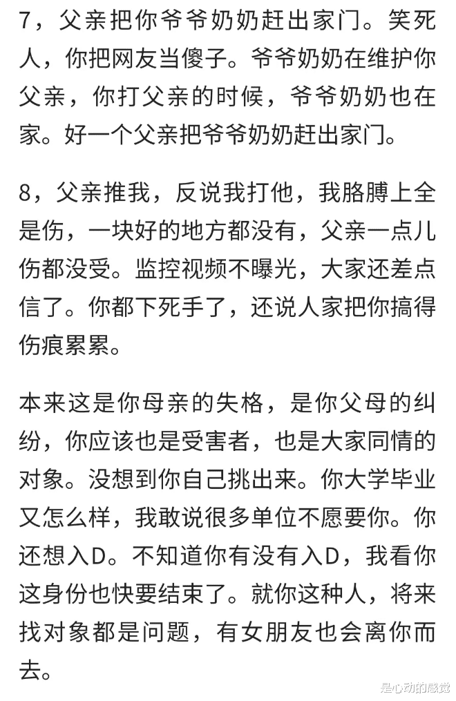 这里别管什么原因回的家,单是放出来的监控视频和邻居的爆料,就已经说明了大儿子说了谎话,尤其是监控里大儿子锁喉抱摔的画面,让人看了就气愤不已。