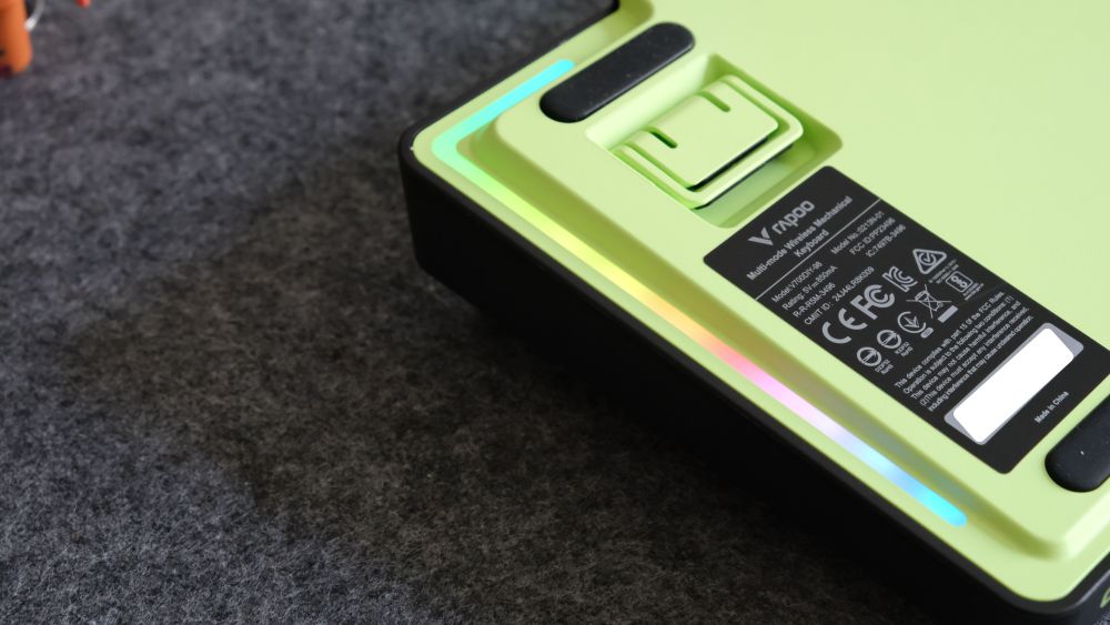键盘四周采用圆润设计,并有斜角,防止割手。底部隐藏了半圈 RGB 灯带,开启后能为桌面增添炫酷的氛围。底部设计简洁,两段式脚撑力度较大,开启后限位很稳,防滑脚垫确保了键盘放置的稳固性。