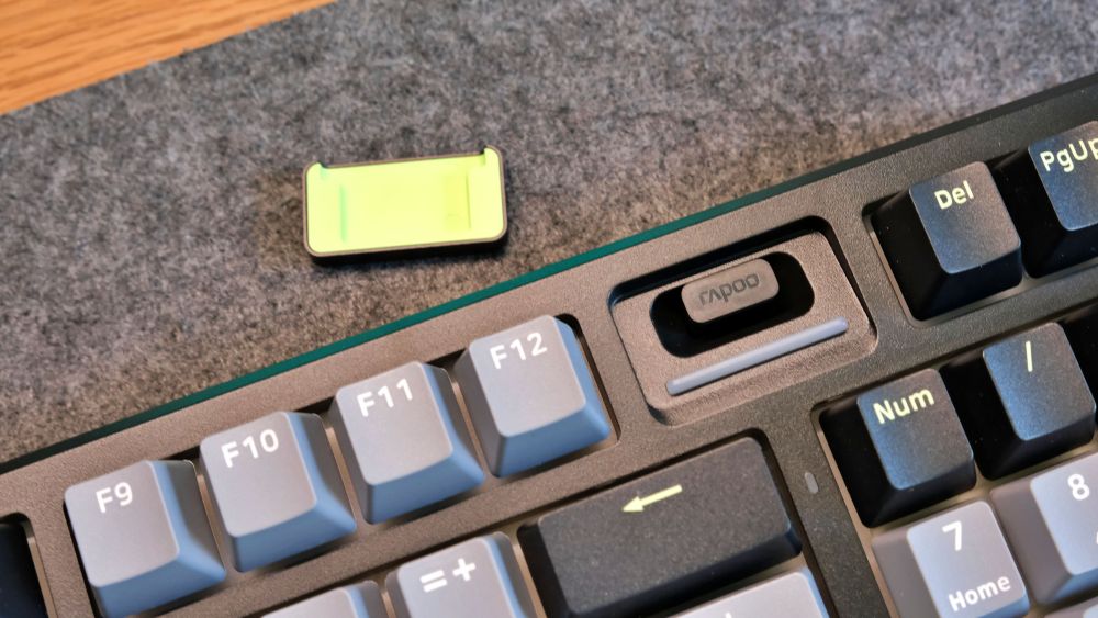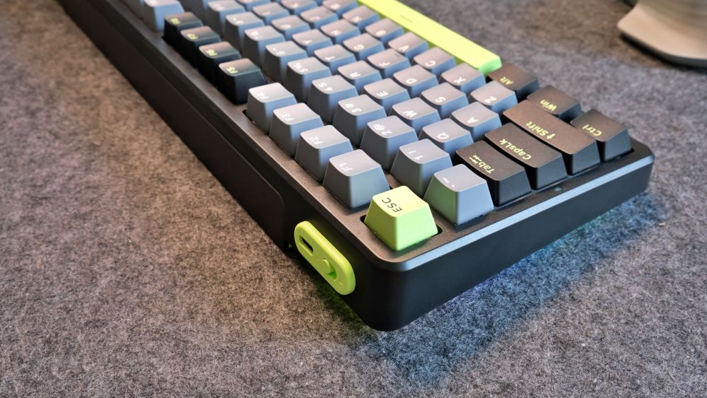 键盘右上角有一块独特的设计,官方叫做“时空幻境仓”,由倾斜的磁吸盖板和导光条组成,打开磁吸盖板后,内部是 USB 接收器的收纳仓,这个设计不仅方便了接收器的收纳,避免丢失,还提升了键盘的整体颜值。此外导光条是多功能的装饰灯,通过Fn+空格可以查看剩余的电量,通过配套的驱动还可自定义颜色、亮度。