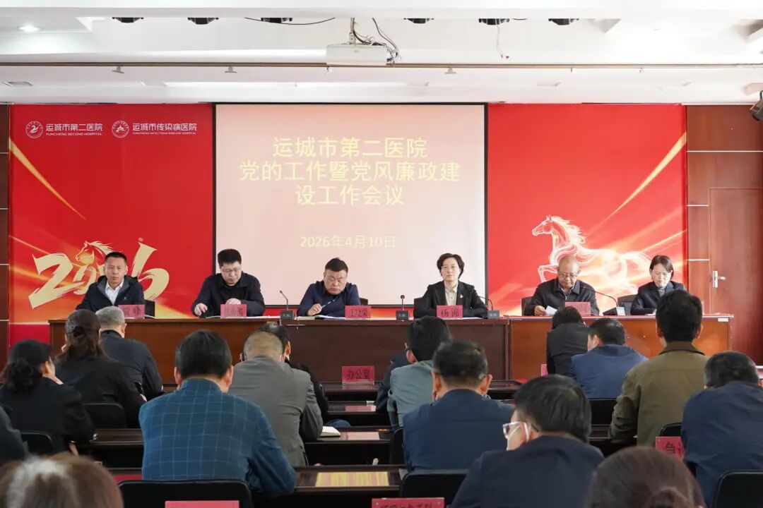 为深入贯彻全面从严治党要求,持续推进党风廉政建设走深走实,4 月 10 日下午,运城市第二医院在欢聚厅召开 2026 年度党的工作暨党风廉政建设工作会议。医院领导班子、中层干部及党员代表参加会议,会议由潘朝霞同志主持。