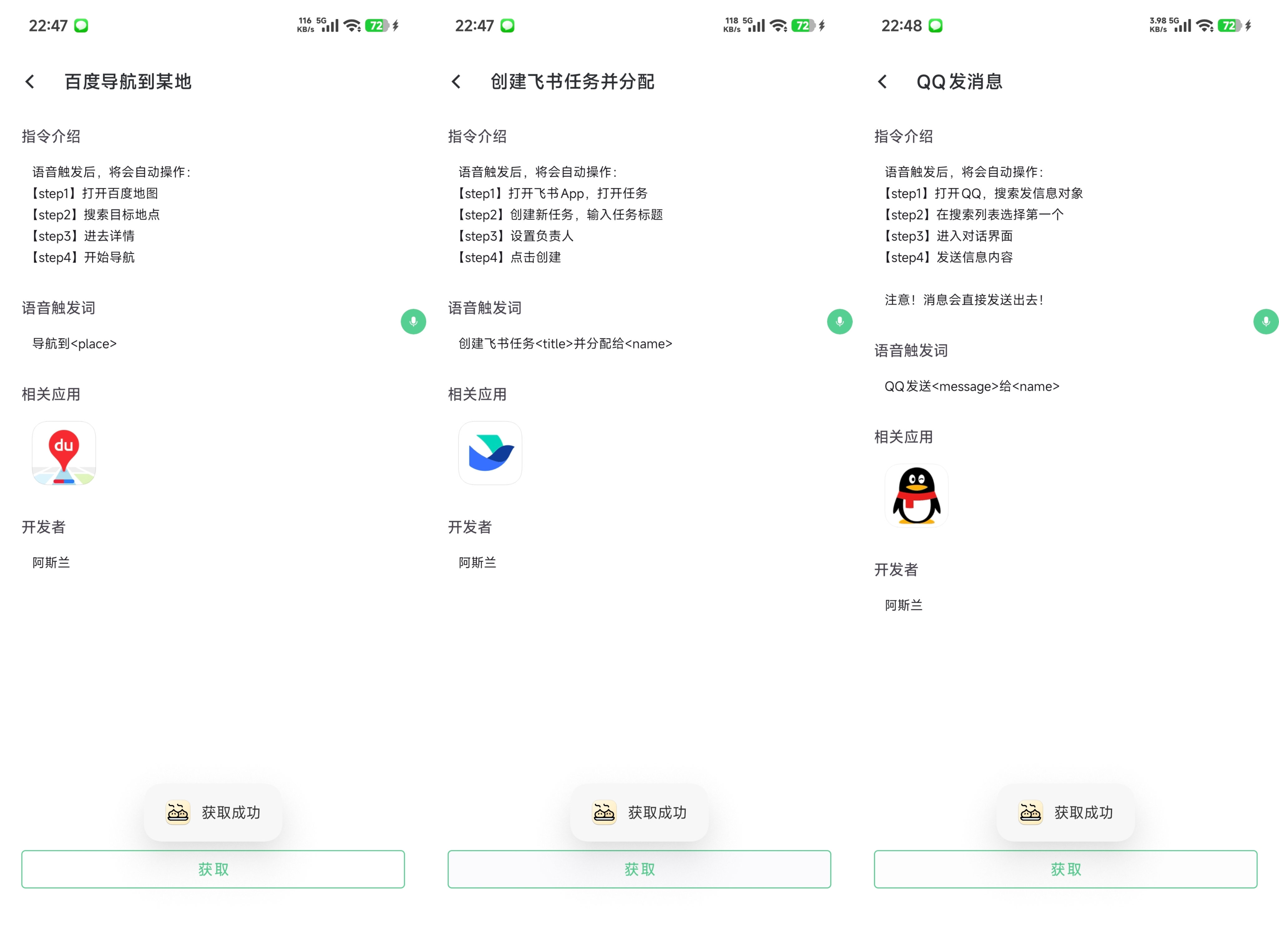 打开煎饺App的瞬间,就能感受到其“零门槛”的设计理念。无需复杂注册,下载后即可进入指令设置界面,界面布局简洁直观,即使是科技小白也能快速上手。核心功能围绕“语音触发跨应用操作”展开,用户只需录制语音指令,再关联想要执行的手机操作,就能实现“一句话办事”。比如设置“上班模式”,可关联自动打开导航、播放通勤音乐、关闭社交软件通知;设置“会议模式”,则能一键静音、开启震动、自动回复工作微信消息,完全复刻了豆包AI手机主打的场景化智能体验。