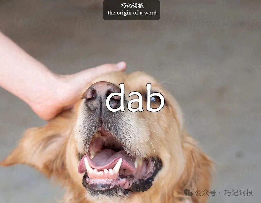 源自中古英语 dabben(轻击、拍打),可能模仿声音或动作,14世纪起指轻轻触摸或涂抹,2010年代起在亚特兰大嘻哈文化中发展为街舞动作(头部埋入弯曲手臂,像打喷嚏),同时指吸食大麻浓缩物(dabbing)。