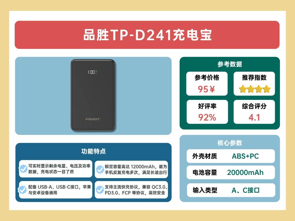 品胜 TP-D32 是一款造型规整的长方形充电宝,大小与手机相近,左上角设有数码显示屏,可显示剩余电量、实时电压和功率,让用户在使用中清楚掌握充电状态。它配备了 20000mAh 的大容量电芯,额定容量为 12000mAh,可为 iPhone 14 Pro 充满约 4 次电。