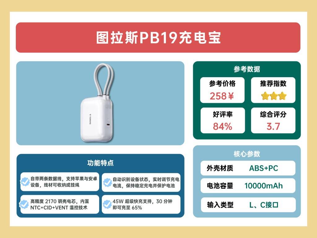 图拉斯 PB19 的电池容量为 10000mAh,额定容量 6500mAh,采用了双自带线设计,其中一条兼容苹果与安卓设备,线材可收纳成手提绳,使用与收纳都较为便利。充电线采用尼龙编织工艺,耐磨性强,不易断裂。