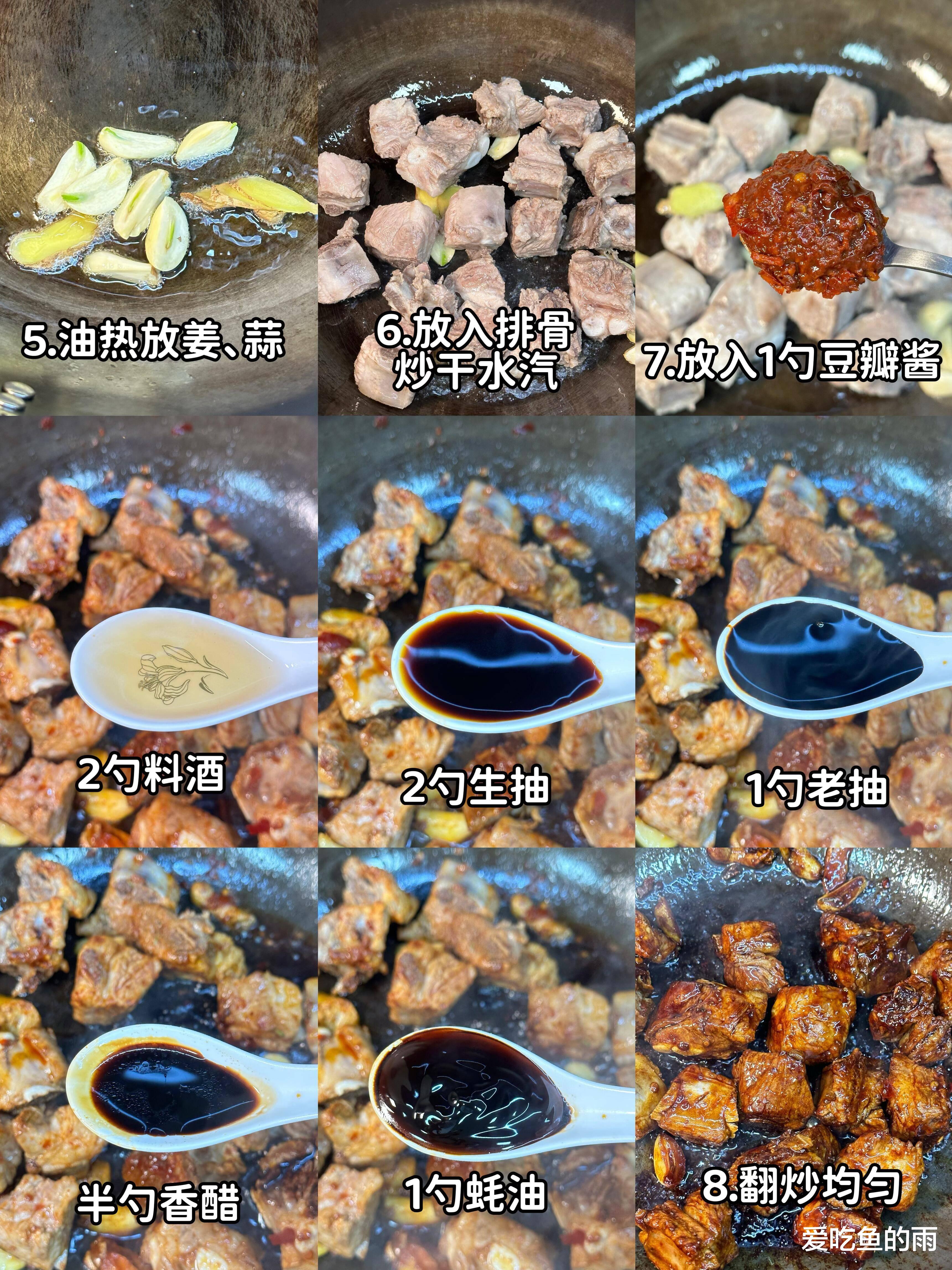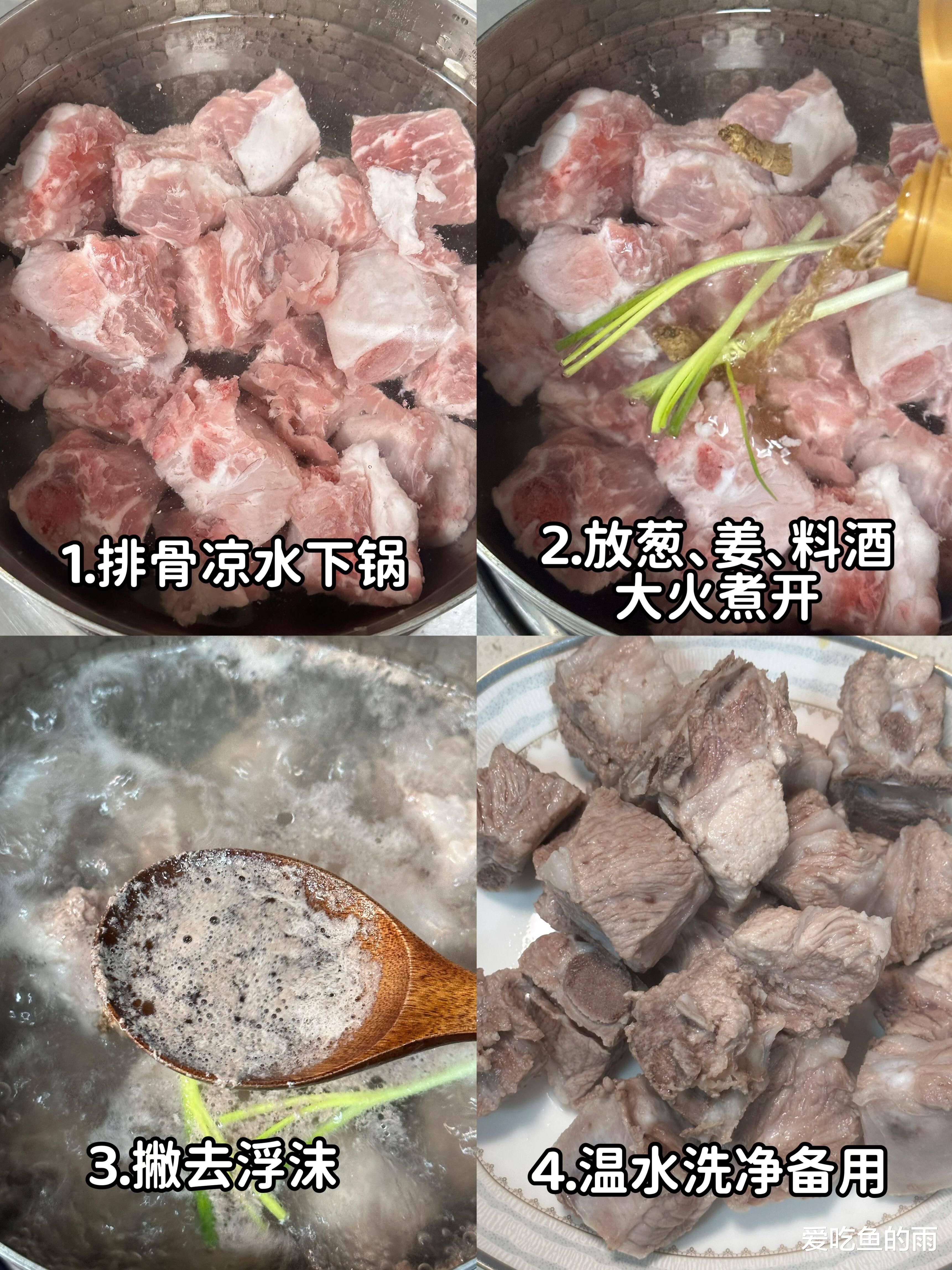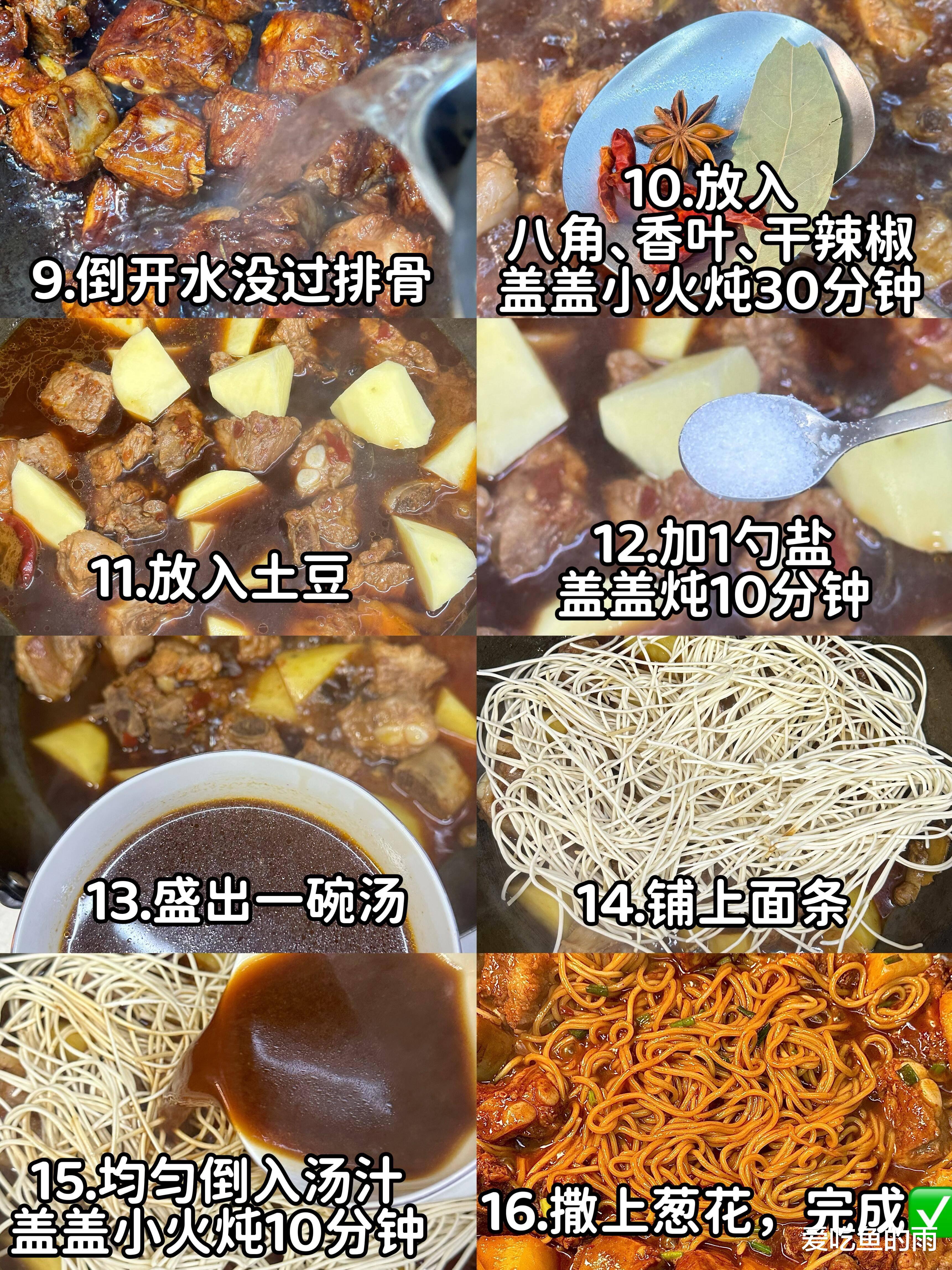 做这道“懒人福音”其实藏着小窍门。排骨得挑带脆骨的小排,剁成麻将块大小,冷水下锅焯水才能把血沫逼出来,捞出来得用厨房纸吸干水分,不然下锅煎的时候容易炸油。起锅烧油,冰糖敲碎炒出枣红色的糖色,那是整道菜红亮的灵魂,倒入排骨快速翻炒,裹上糖衣后加葱姜蒜、八角桂皮,再倒生抽老抽蚝油,这时候必须加开水!没过排骨炖半小时,这就是面的“灵魂汤底”。土豆要选黄心的,切滚刀块丢进去,撒点盐,把鲜面条均匀铺在菜上——注意了,千万别把面泡在汤里,要像盖被子一样盖在排骨上,盖紧锅盖中小火焖十分钟。我第一次做时水放多了成了煮面汤,后来才知道,这叫“菜养面,面养菜”,靠菜蒸腾出的热气把面条焖熟,才最入味。