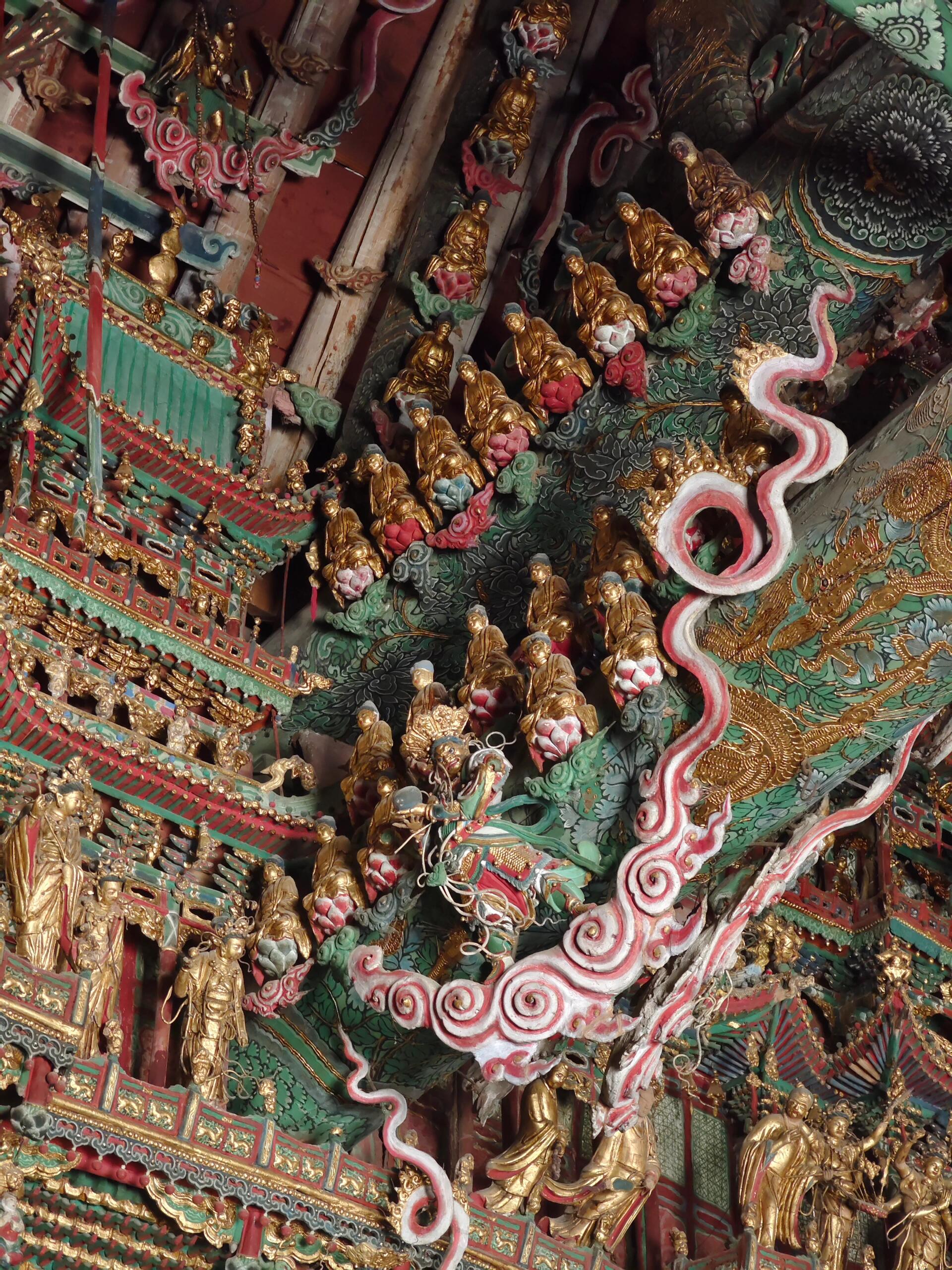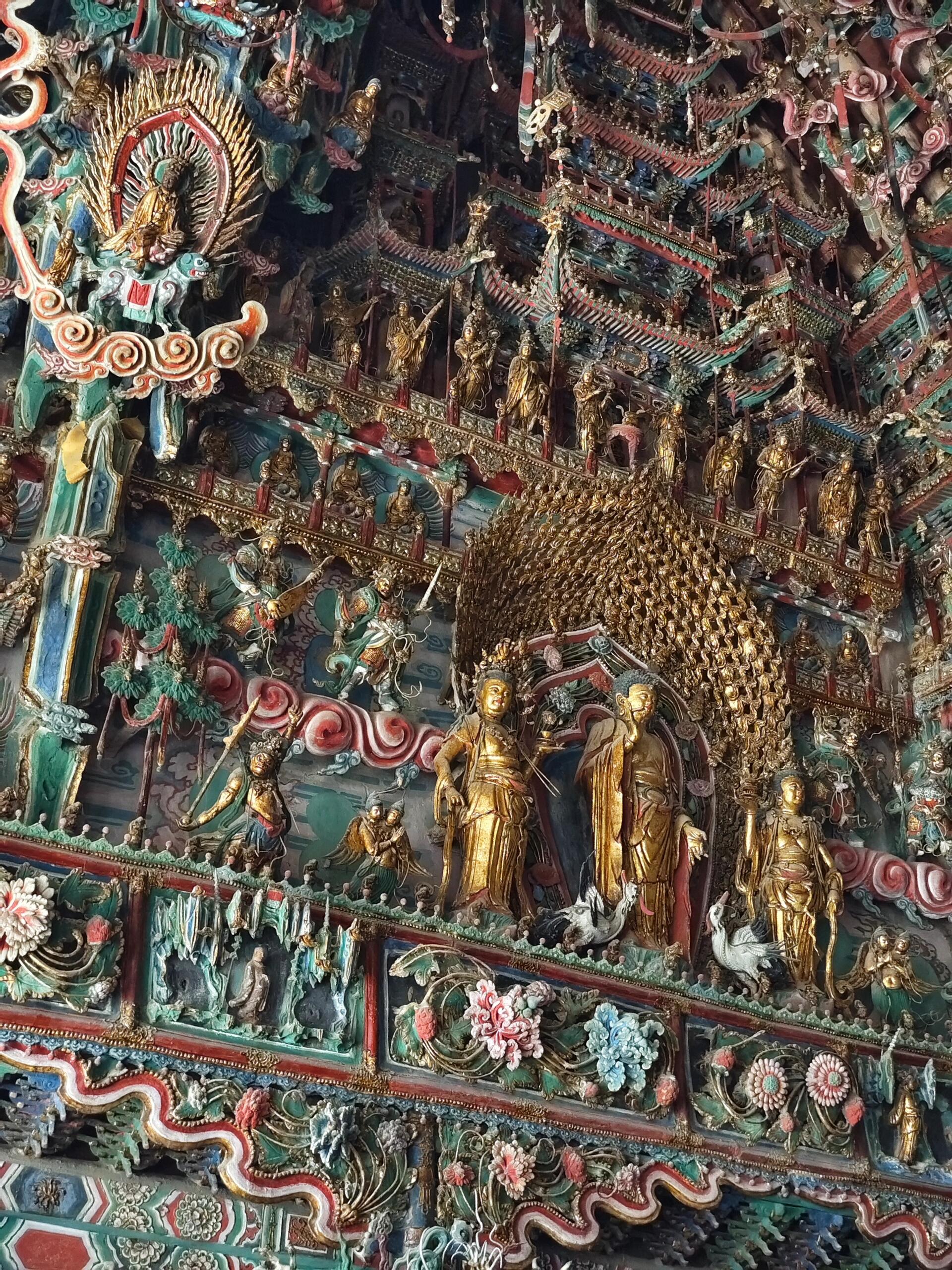 走进小西天,最令人叹为观止的当属大雄宝殿内的清代悬塑。悬塑作为中国古代彩绘泥塑的特殊样式,在金元以后的山西寺院道观中颇为流行。但像小西天这样规模宏大、保存完好的悬塑作品,在全国范围内都极为罕见。整个大雄宝殿内,2000余尊塑像错落有致地分布在墙壁、梁架之间,构成了一幅气势恢宏的佛教艺术长卷。