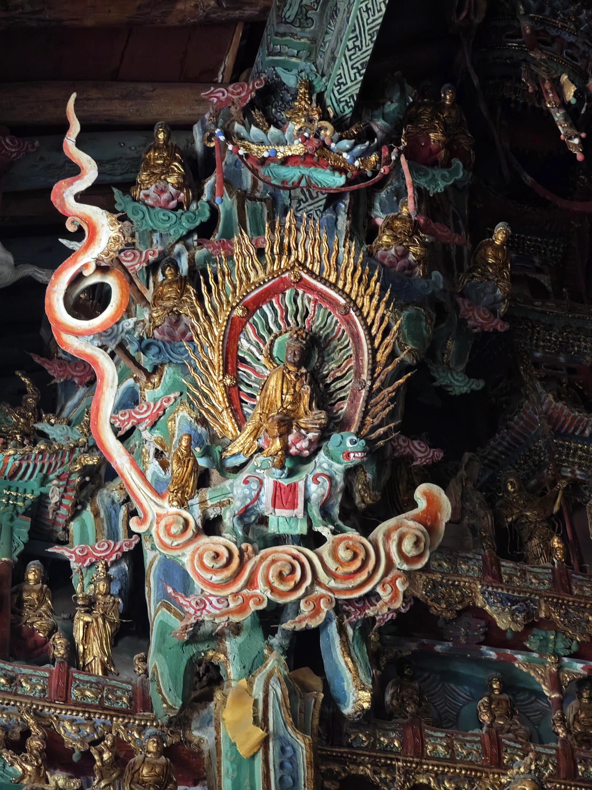 殿内主供释迦牟尼、药师、弥陀、毗卢遮那和弥勒五尊佛像,每尊佛像都神态庄严、造型优美。环绕主佛的众多胁侍菩萨、弟子、天王等塑像,或手持法器,或神态安详,每一尊都刻画得细致入微。南墙上,“四方三圣”“四大天王”等佛教故事被生动呈现;北墙上,则塑着须弥山上三十三层“仞利天”、佛传故事和释迦牟尼的本生传说。这些悬塑不仅造型逼真,色彩更是鲜艳夺目,历经数百年依然光彩照人。