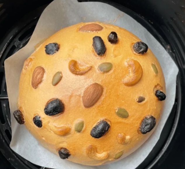 用刮刀把蛋白霜舀到铺了油纸的烤盘上,随意堆成小山包的样子,不需要抹平,自然的形状反而好看。表面撒上葡萄干和坚果碎。烤箱提前预热到150度,中层烤20分钟左右,观察到表面变成浅金黄色就可以了。刚出炉的云朵蛋糕很娇气,稍微凉一分钟就会自然回缩一点,这是正常现象。